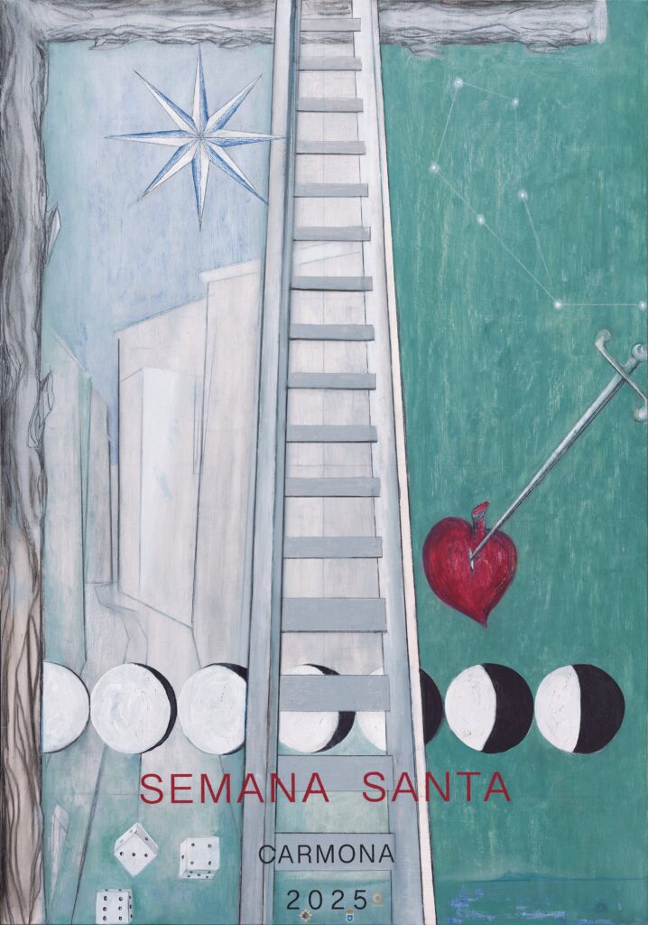 La cruz arbórea se haya esquinada en el lateral izquierdo cerrando así la composición, a partir de la cual se desarrolla toda la escena hacia la derecha. La escalera con una presencia insoslayable, divide radicalmente dos ámbitos de significación en los que a través de un color vibrante y meditado en sus tonos nos trasmiten sentimientos de soledad y desposeimiento. Justamente se alude al dolor en un tono verde, muy pensado, sordo y hasta agrio que domina la mitad derecha. Este espacio contiene la expresión dramatizada del corazón traspasado por la daga que domina el conjunto de la escena. Un icono simbólico de gran patetismo formal, que explícitamente hace referencia la profecía de Simeón, pero también alude a los Dolores de la madre al pie de la cruz. Clara alusión a la iconografía del Stabat Mater de profunda devoción cultural religiosa que recogen los evangelios. No obstante, tengamos en cuenta en este sentido, que en la ciudad de Carmona existen y procesionan nada menos que cuatro devociones consagradas a esta advocación de los Dolores. De tal modo, el corazón purpura contrasta con el fondo verdoso, adquiriendo gran protagonismo. Un corazón henchido y traspasado enérgicamente por un estilete que, a su vez, geométricamente, conecta con una constelación sobre un cielo verdoso áspero y pasional. Se trata de la constelación del Boyero que preside el cielo en el mes de abril en que este año 2025 tiene lugar la Semana de pasión.