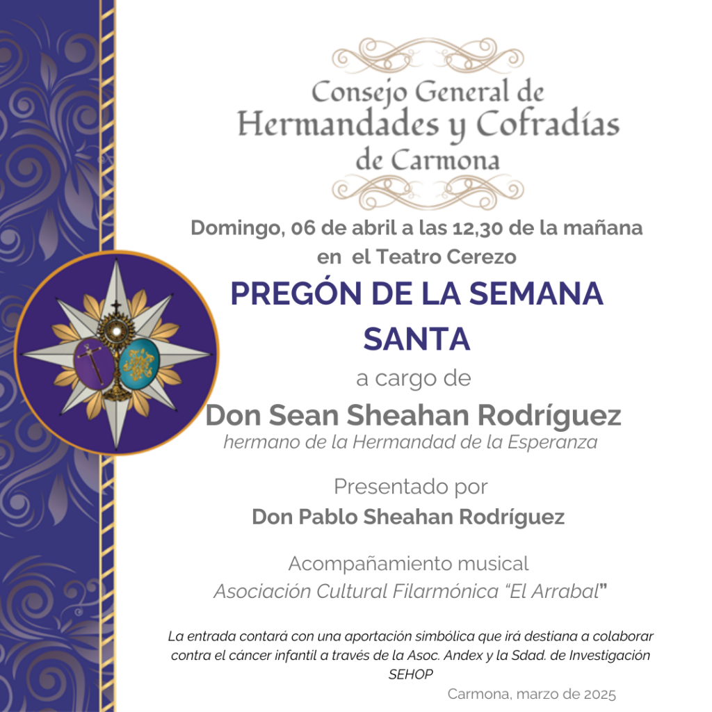 Don Shean Sheahan Rodríguez, hermano de la Hermandad de la Esperanza, será el encargado del anuncio de esa semana en la que rememoraremos la pasión, muerte y resurrección del Señor y que esperamos todos los cofrades con anhelo, con el acompañamiento musical de la Asociación Cultural Filarmónica «El Arrabal».